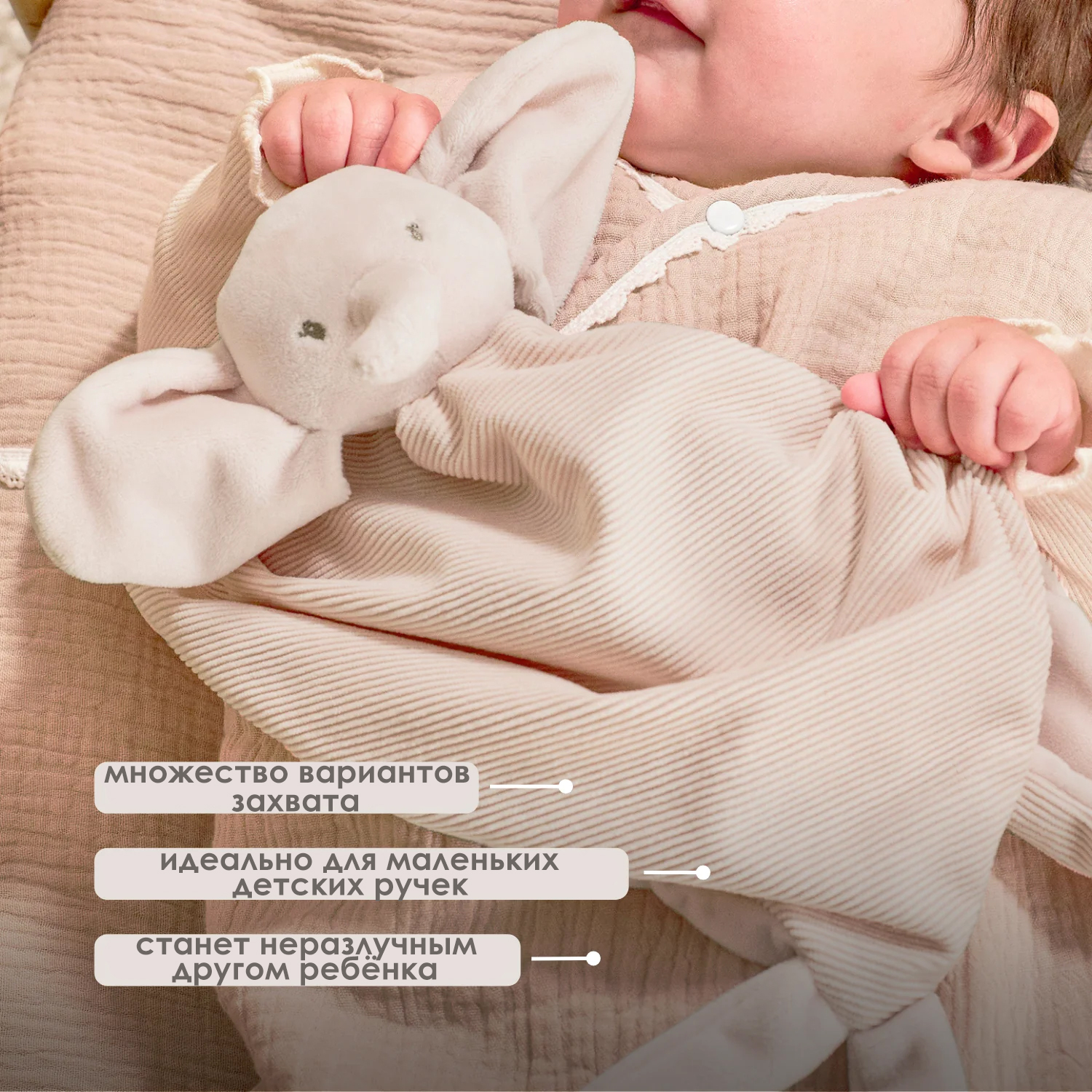 - идеально подходит для новорождённых, станет постоянным другом для малыша дома в кроватке или в коляске на прогулке