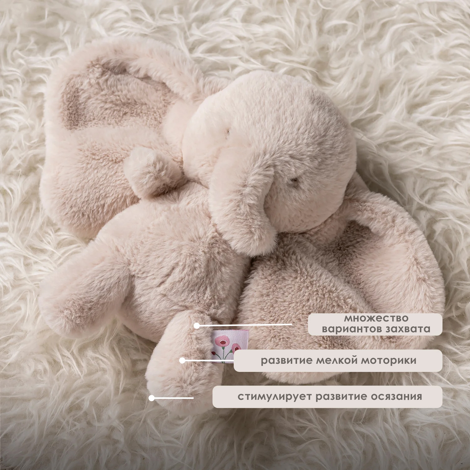 Этот очаровательный плюшевый слоник песочного цвета быстро станет любимым другом вашего малыша. Его мягкий плюшевый мех так и манит к себе, а ещё он дарит ощущение безопасности. Длинный хобот, висячие уши и крепкие ноги дают множество возможностей для хватания, помогая ребёнку в игровой форме развивать тактильную чувствительность и мелкую моторику. Благодаря дружелюбному виду и нейтральным цветам этот слоник идеально впишется в любую детскую. Он идеально подходит для диких воображаемых приключений днём и уютных объятий перед сном — незаменимый компаньон на все случаи жизни.