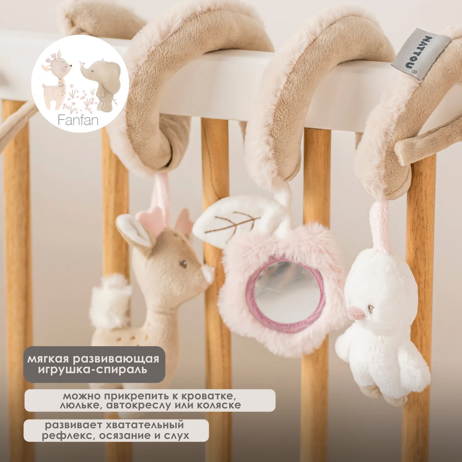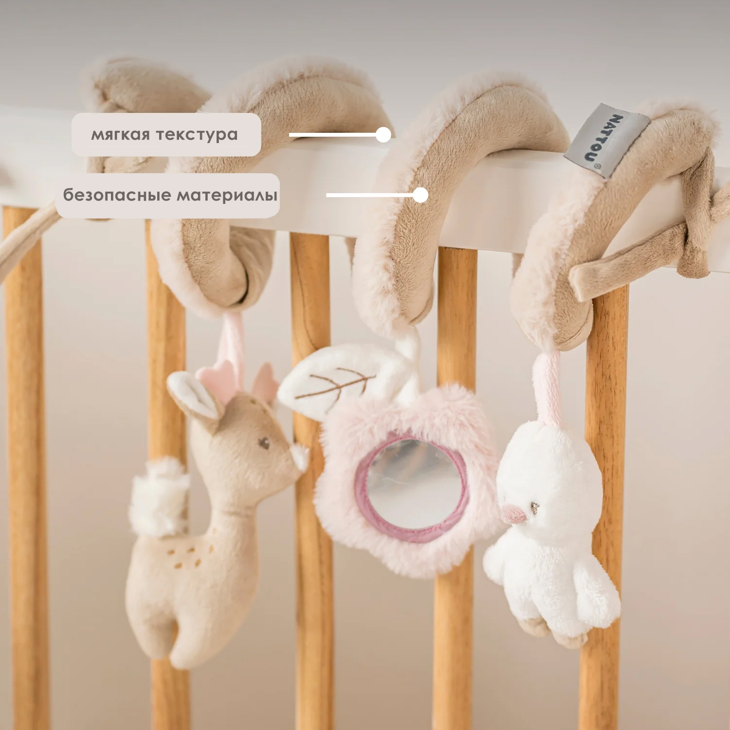 Эта мягкая развивающая спираль от Nattou станет идеальным спутником для вашего малыша как дома, так и в дороге. Забавные фигурки с погремушкой, пищалкой и шуршащей бумагой пробуждают любопытство и побуждают маленькие ручки хватать и исследовать. Таким образом, в игровой форме стимулируются осязание и слух. Благодаря гибкой форме спираль можно легко прикрепить к кроватке, люльке, автокреслу или коляске. Этот красочный аксессуар подарит бесконечное веселье и станет прекрасным подарком для малыша на любой праздник.