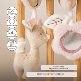 - оснащена безопасным зеркалом, погремушкой, пищалкой и шуршащей бумагой