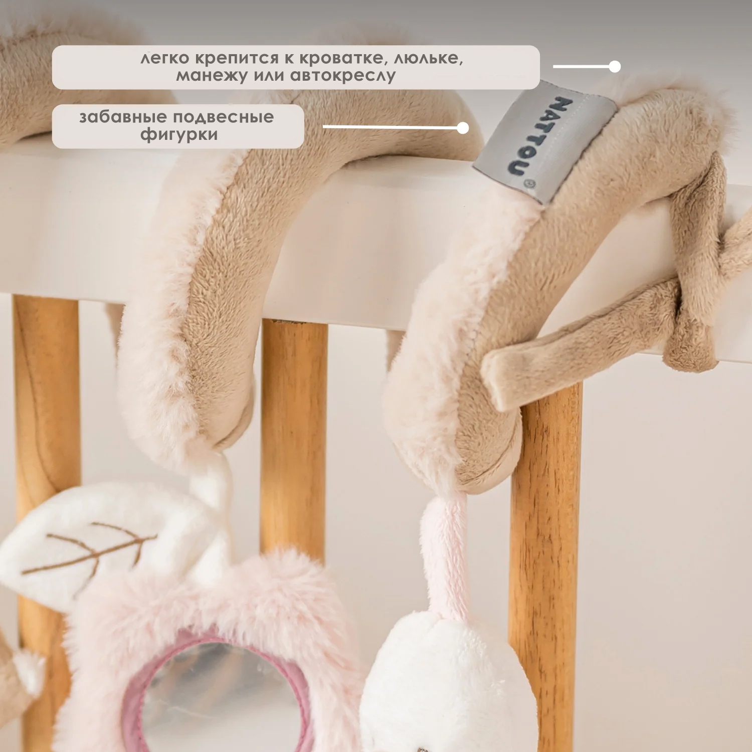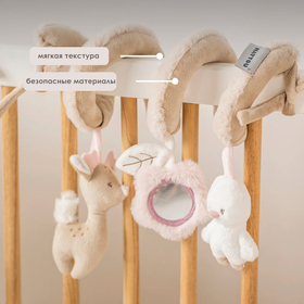 - Легко крепится к кроватке, люльке, манежу или автокреслу