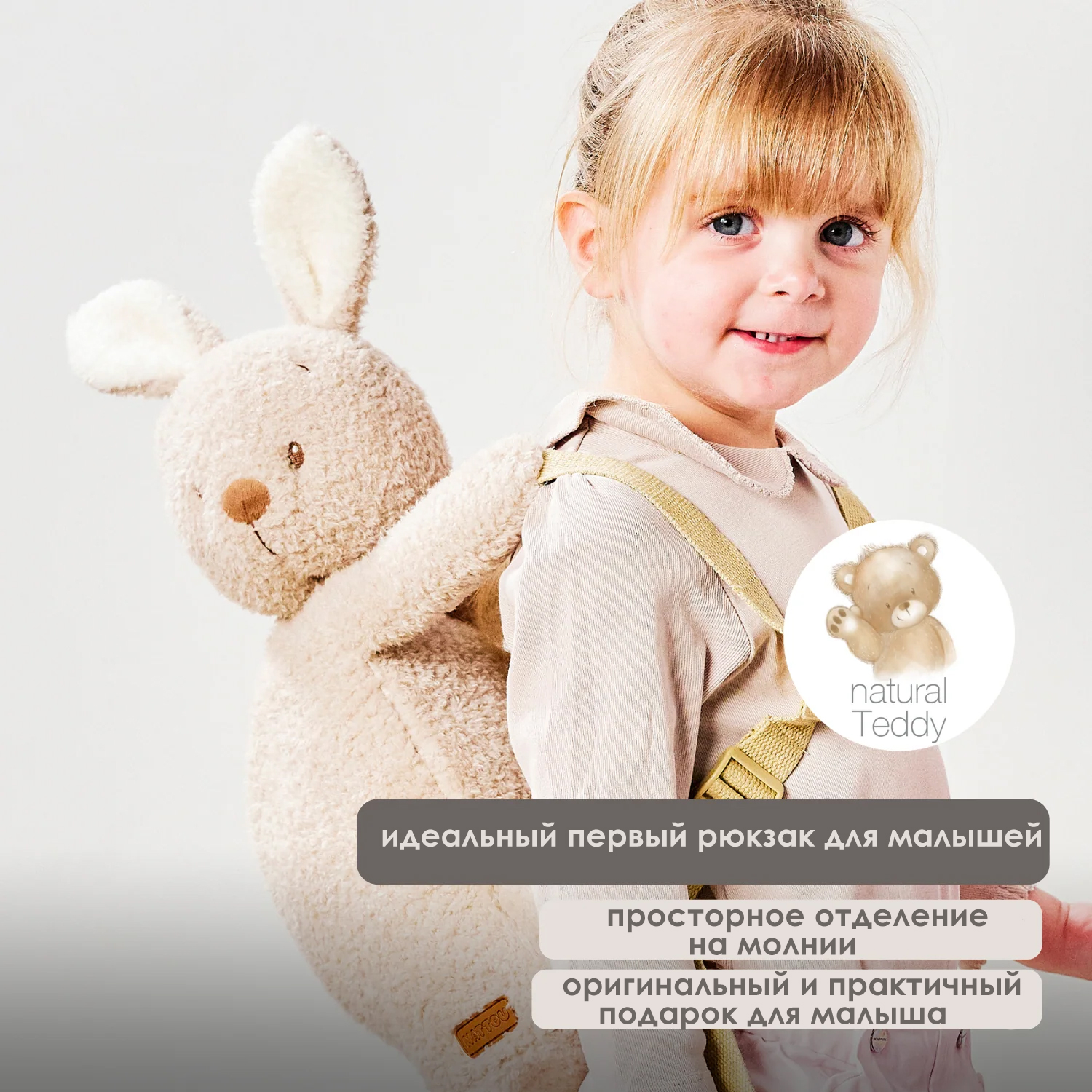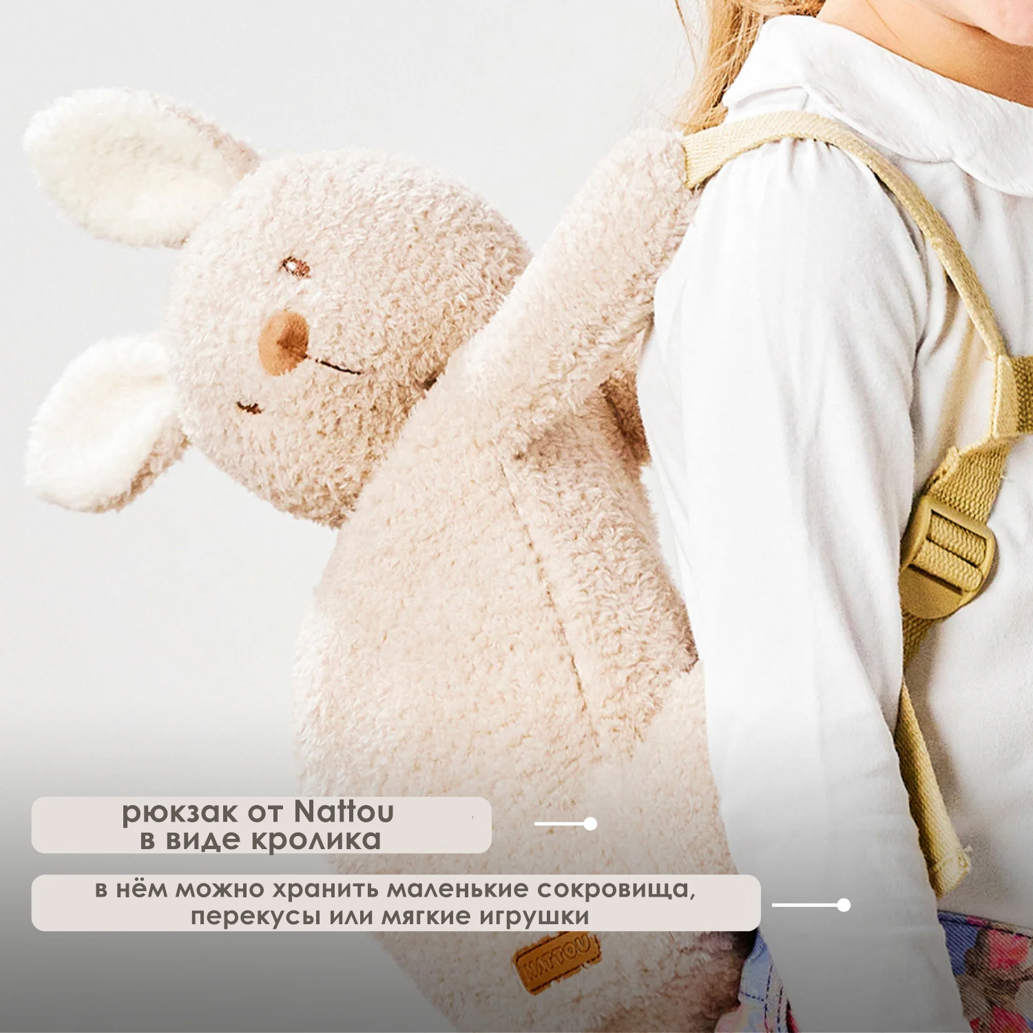 Рюкзак-кролик Nattou — идеальный первый рюкзак для малышей. Благодаря сверхмягкой плюшевой ткани и милому дизайну он быстро становится их любимым спутником. В нём удобно хранить маленькие сокровища, перекусы или мягкие игрушки и брать их с собой куда угодно. Практичный и милый подарок для малыша, сочетающий в себе очарование и удобство.